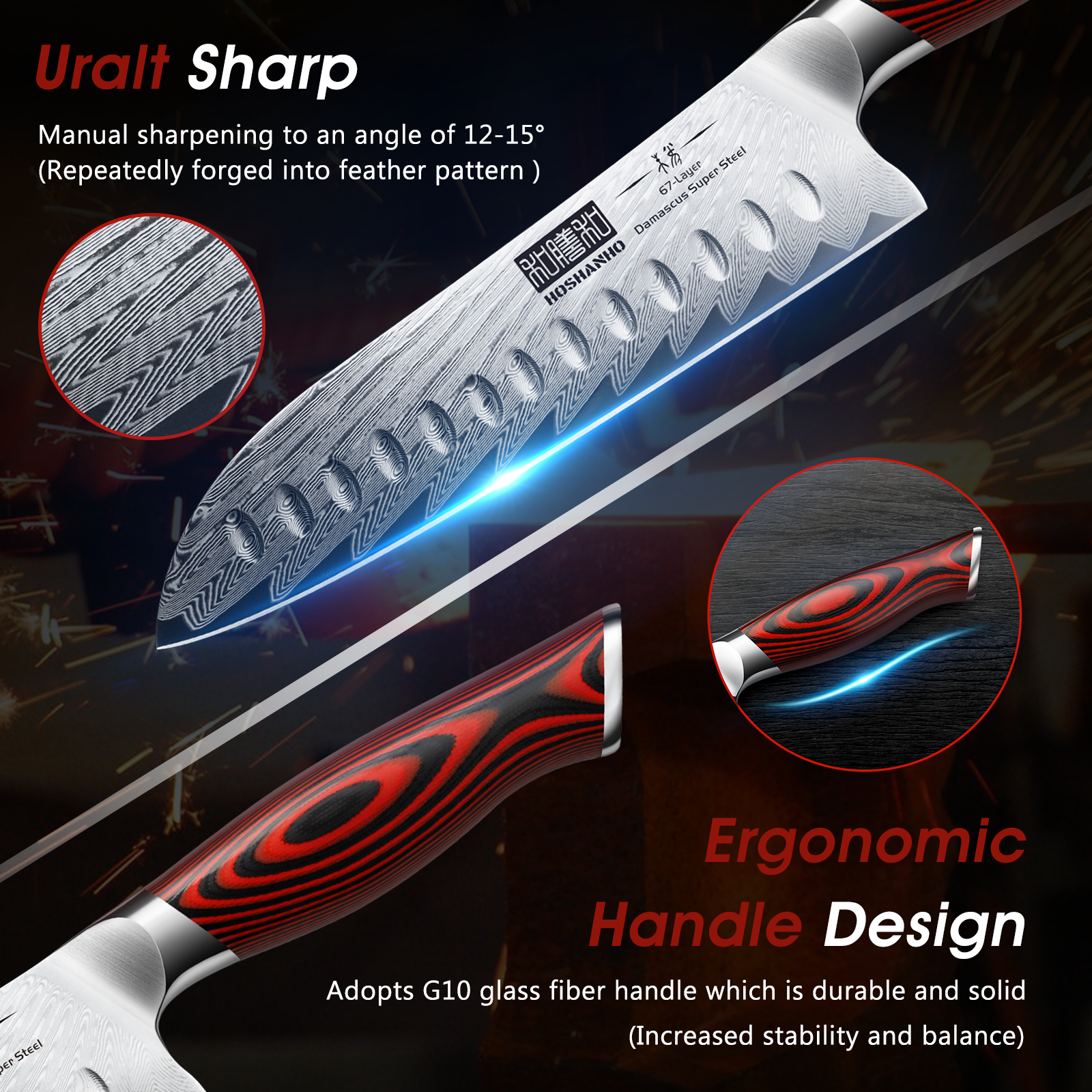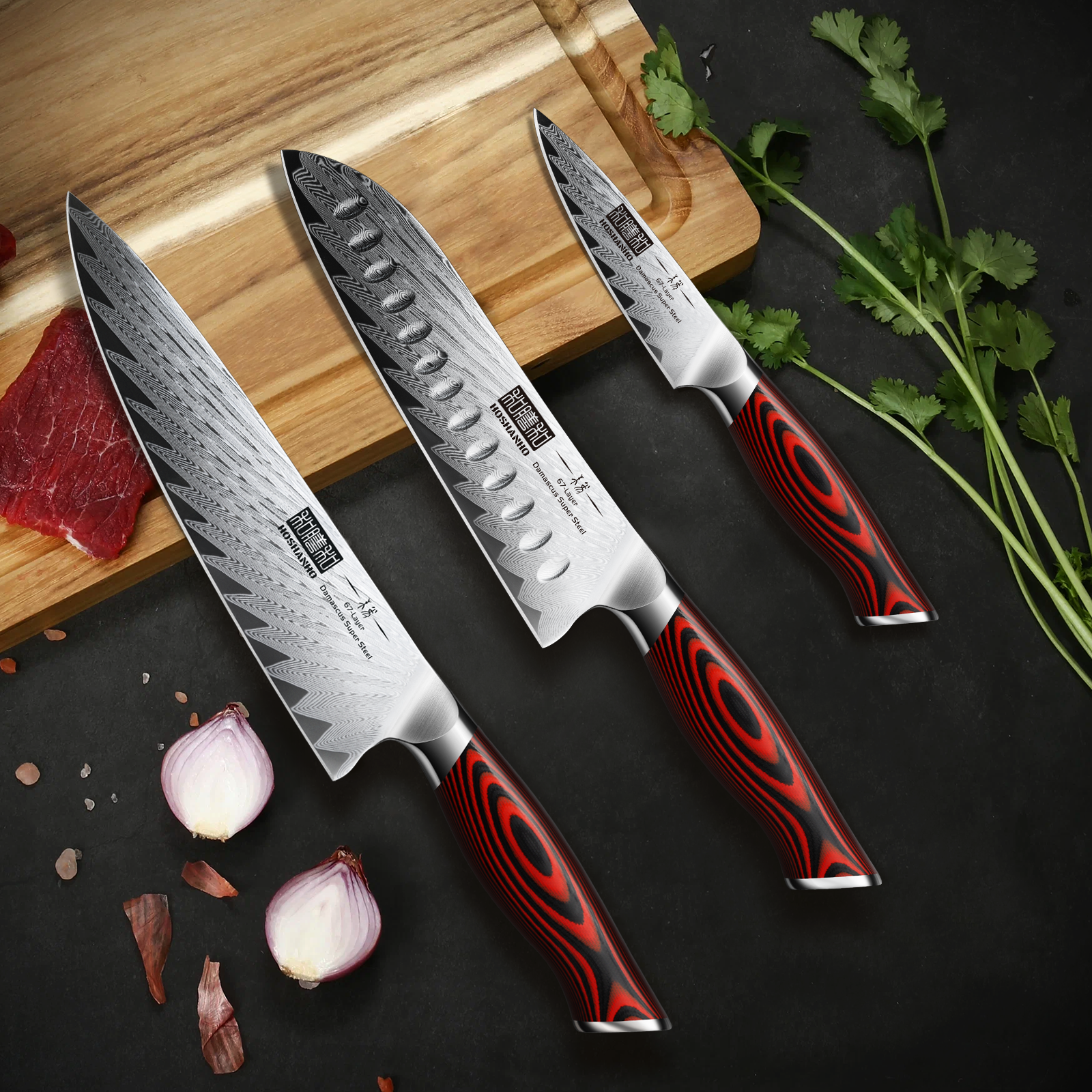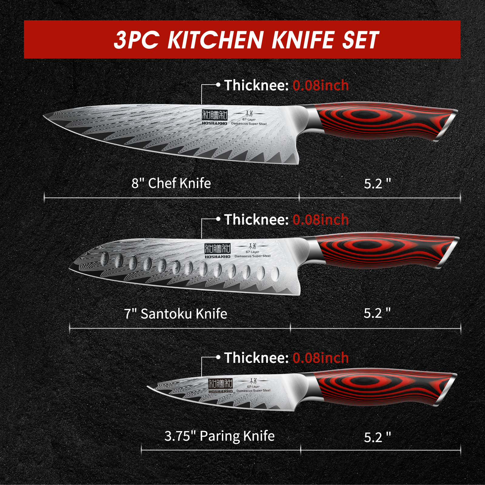 - Professionelles Küchenmesser – Das 3-teilige professionelle Küchenmesser von HOSHANHO ist für den privaten und professionellen Gebrauch geeignet. Unser Messerset besteht aus einem 8-Zoll-Kochmesser, einem 7-Zoll-Santokumesser und einem 3,75-Zoll-Schälmesser. Mit diesem Küchenmesserset können Sie alle Ihre Küchenarbeiten wie Hacken, Schneiden und Würfeln erledigen.