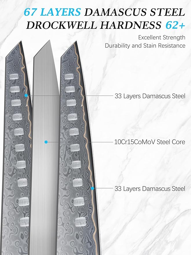 67-Layer Damascus Steel – Japanese 10Cr15CoMoV core wrapped in 67 hand-forged layers, HRC 62, chip-resistant with superior edge retention.