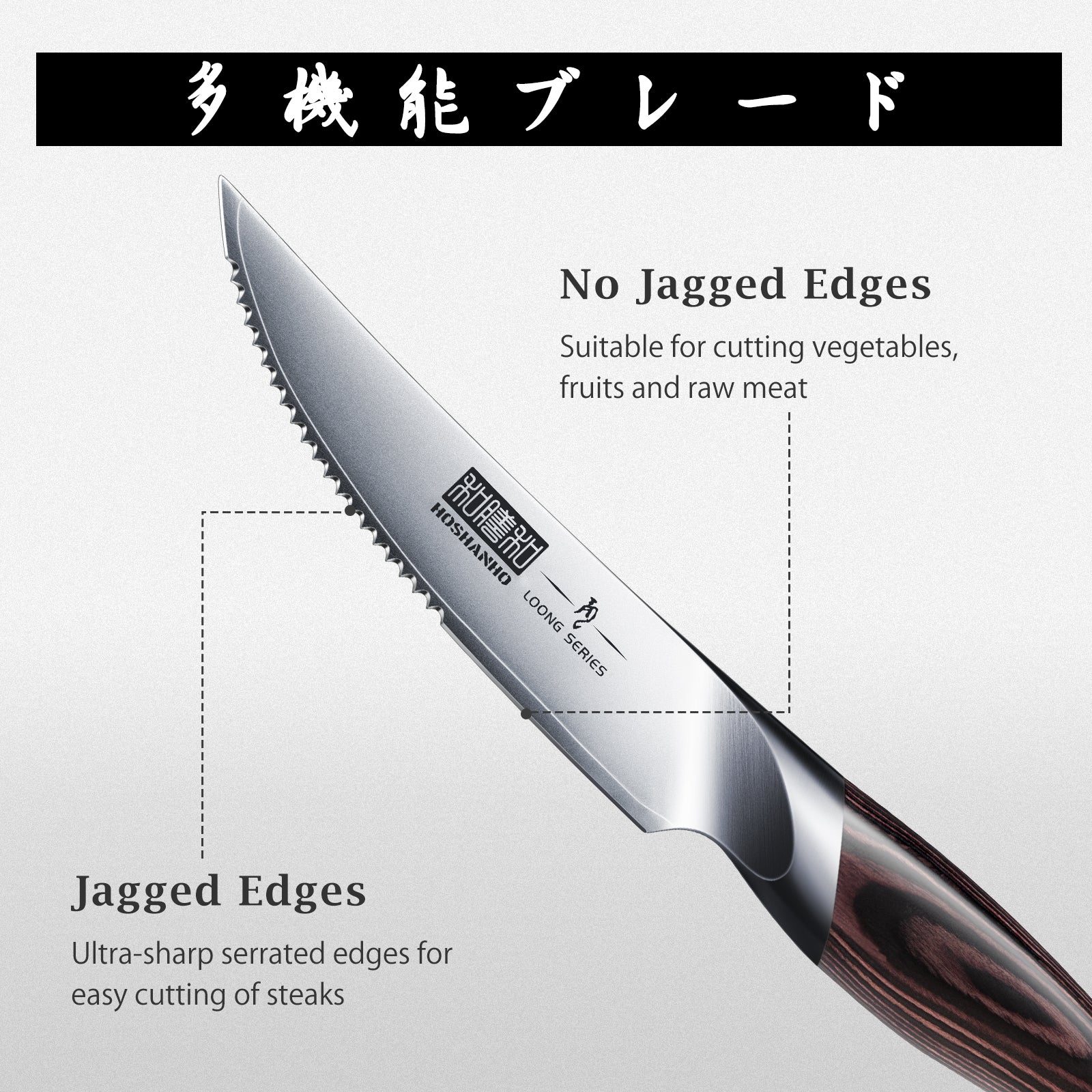 - 【Japanischer AUS-10-Stahl】HOSHANHO-Küchensteakmesser werden aus hochwertigem japanischem AUS-10-Edelstahl mit hohem Kohlenstoffgehalt gefertigt, speziell wärmebehandelt und eisgehärtet, um den Messern eine hohe Härte (60 HRC) zu verleihen und gleichzeitig eine lange Haltbarkeit und rasiermesserscharfe Klingen zu gewährleisten