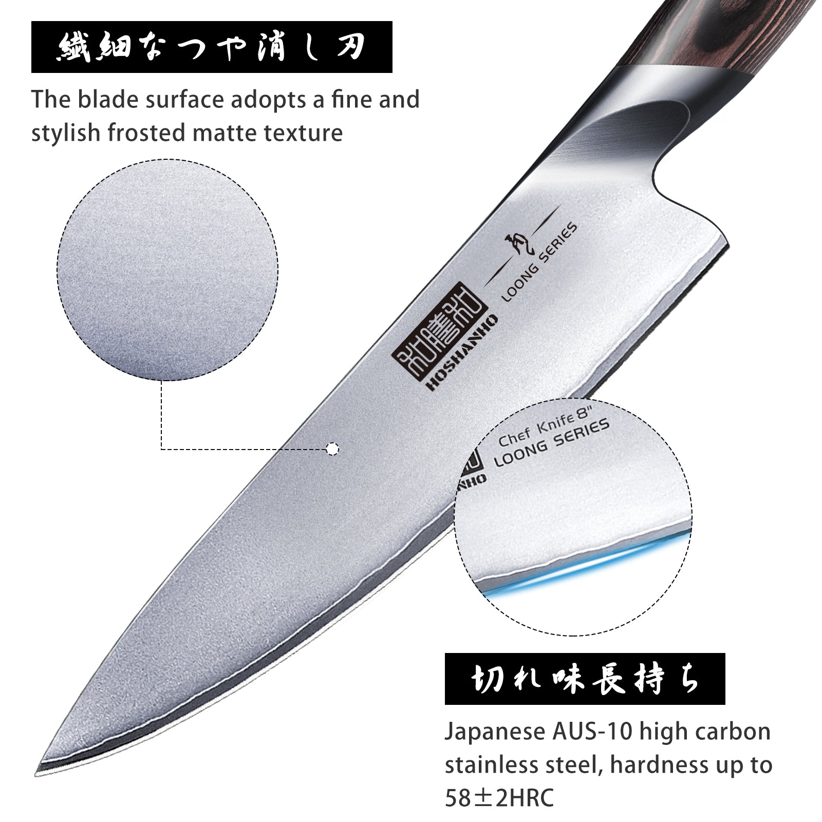 - 【Japanischer AUS-10-Stahl】 Dieses Messerset besteht aus hochwertigem, kohlenstoffreichem japanischem AUS-10-Edelstahl und hat eine Härte von bis zu 58 HRC. In Kombination mit einem präzisen Wärmebehandlungsprozess erhält das Küchenmesser eine außergewöhnliche Zähigkeit. Dadurch ist es weniger anfällig für Brüche oder Verformungen beim Schneiden harter Zutaten und gewährleistet so eine hervorragende Haltbarkeit.