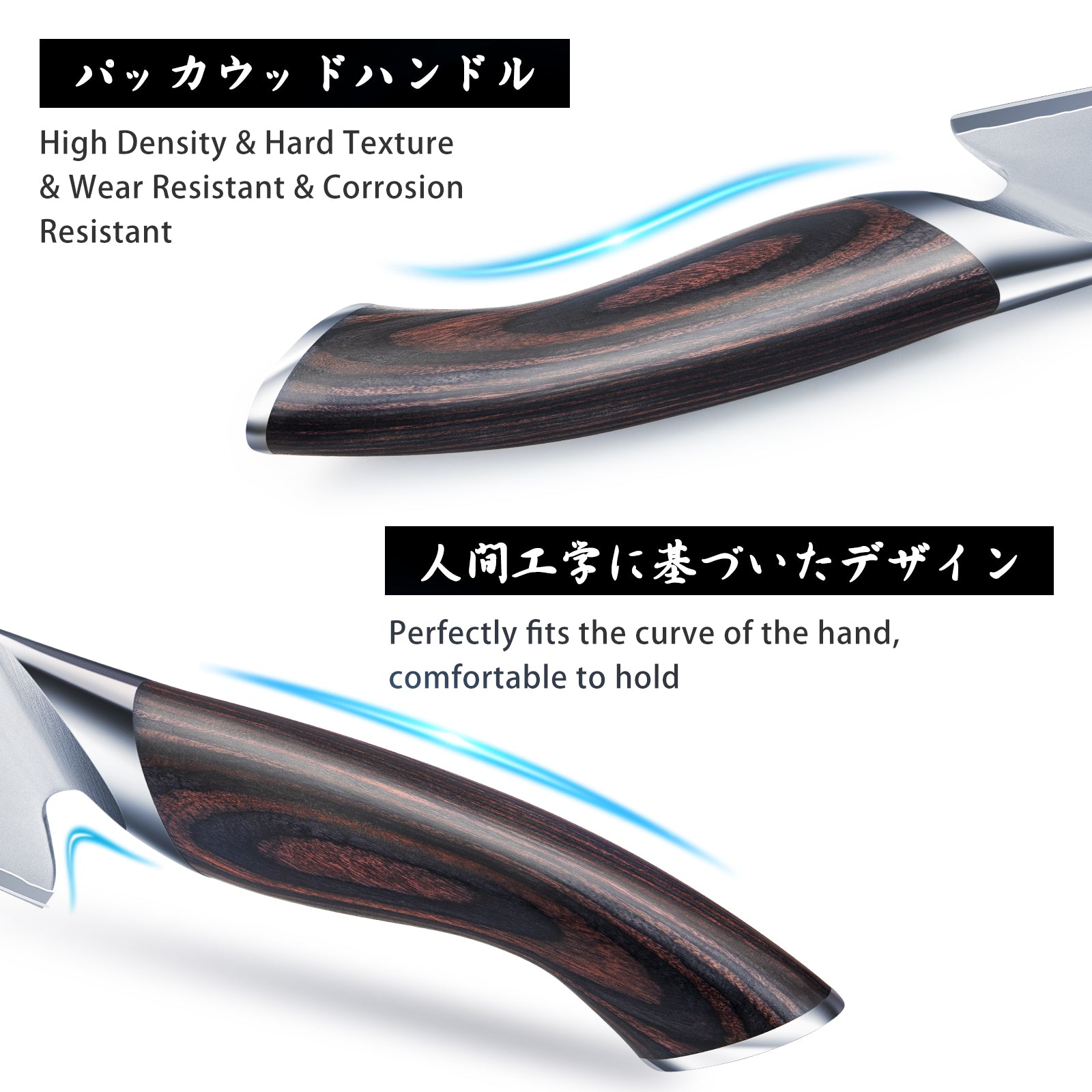- 【Ergonomischer Pakkaholz-Griff】Der ergonomische Griff des Messersets ist so konzipiert, dass er perfekt in jede Handform passt und die Ermüdung und Beschwerden, die bei längerem Gebrauch des Messers auftreten können, erheblich reduziert. Das Gewicht und der Schwerpunkt des Griffs sind sorgfältig berechnet, wodurch das Messer im Gebrauch flexibler wird