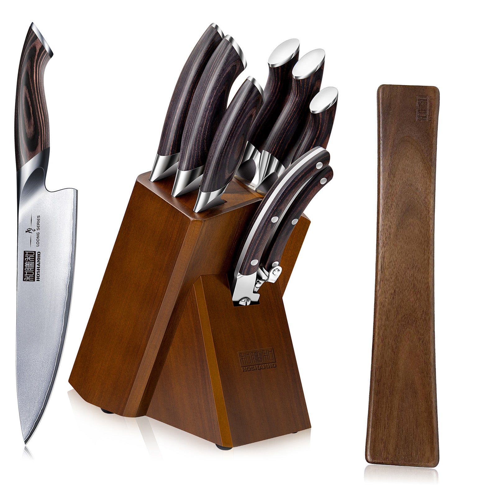 - 【Mehrzweck-Messerset】 Das 8-teilige Messerset von HOSHANHO beinhaltet: 8-Zoll-Kochmesser, 8-Zoll-Brotmesser, 7-Zoll-Santokumesser, 7-Zoll-Filetiermesser, 6-Zoll-Allzweckmesser, 3,75-Zoll-Schälmesser sowie eine Küchenschere und einen Messerblock aus Hartholz. Ein multifunktionales Messerset ermöglicht Ihnen die Auswahl des am besten geeigneten Werkzeugs