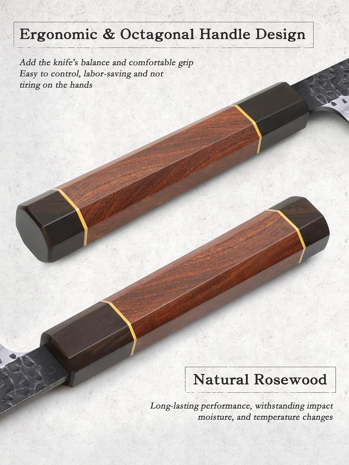 Ergonomic Octagonal Handle – Japanese-style rosewood handle with copper accents provides a secure grip, precise control, and reduced fatigue during extended use.
