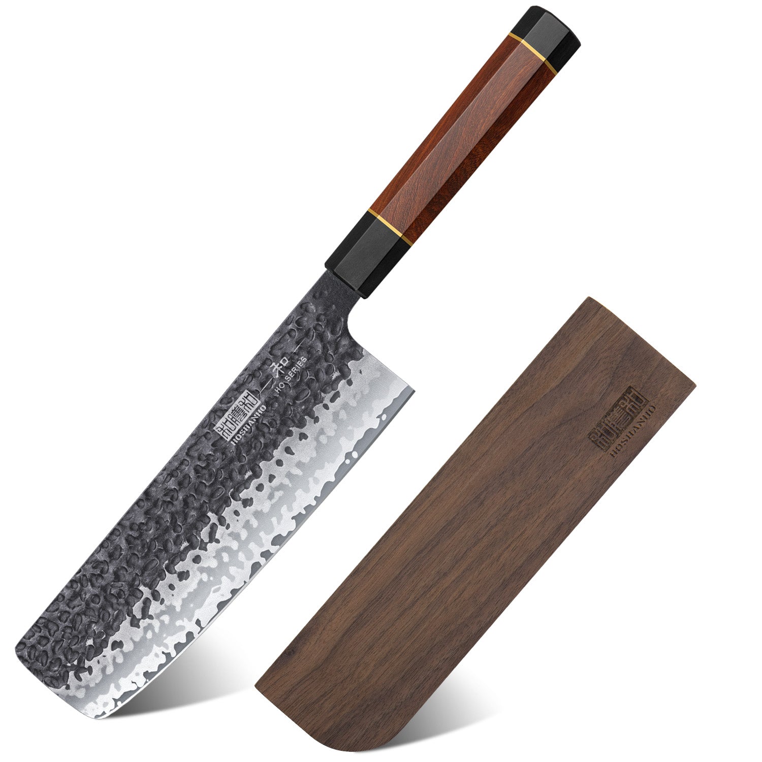 7" VG-10 Nakiri Knife with Sheath – Combines the versatility of a chef’s knife with a cleaver’s square shape. Ideal for chopping vegetables like sweet potatoes and zucchini. Comes with HSH Walnut Sheath (8.94" × 2.48" × 0.47") with magnetic closure and laser-engraved logo for secure storage.