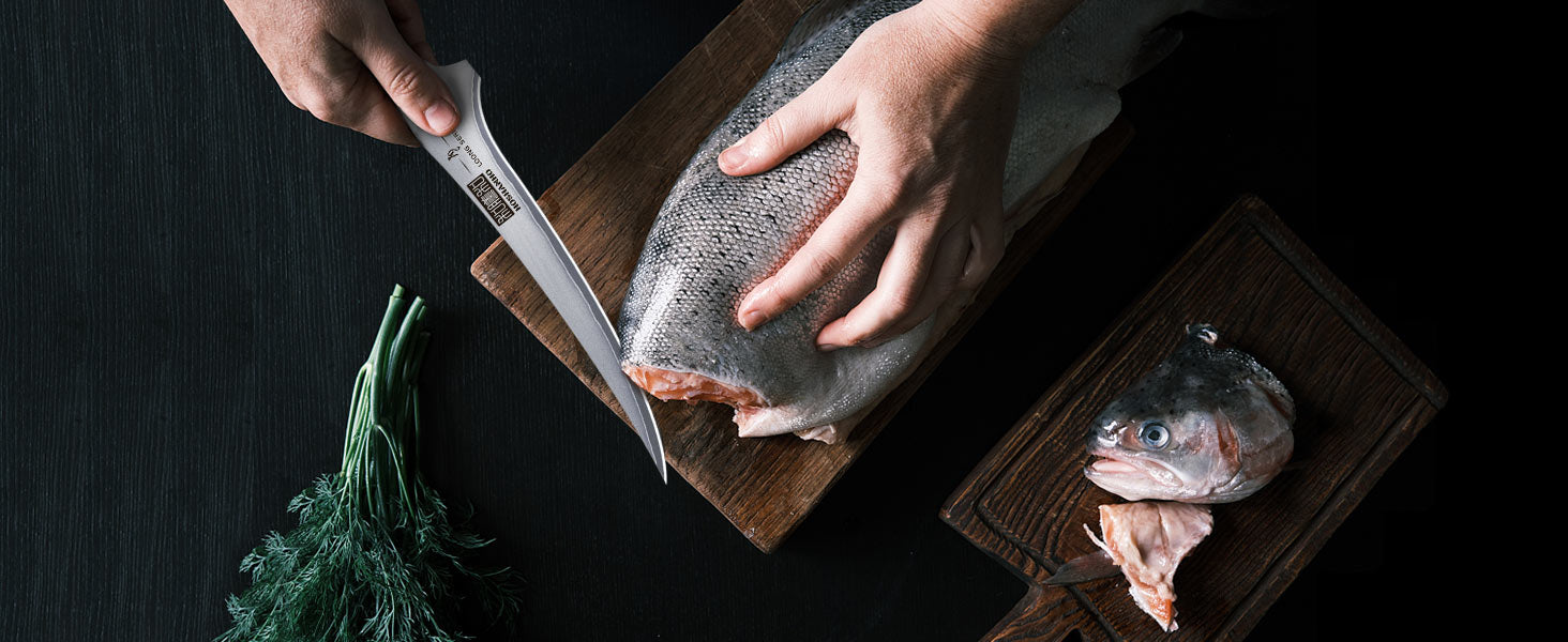 Fillet knives have a thin, sharp, curved blade designed for effortlessly cutting and scaling fish.