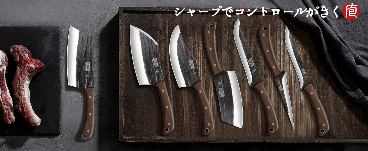 This 9-piece hand-forged butcher knife set includes everything you need for efficient, all-purpose food preparation. The collection features a 6" Bone Chopper, Meat Cleaver, Viking Knife, Cleaver Knife, Fillet Knife, Dividing Knife, Paring Knife, a durable knife bag, and a solid wood cutting board with juice groove, designed for stability, durability, blade protection, and to catch juices for cleaner cutting.